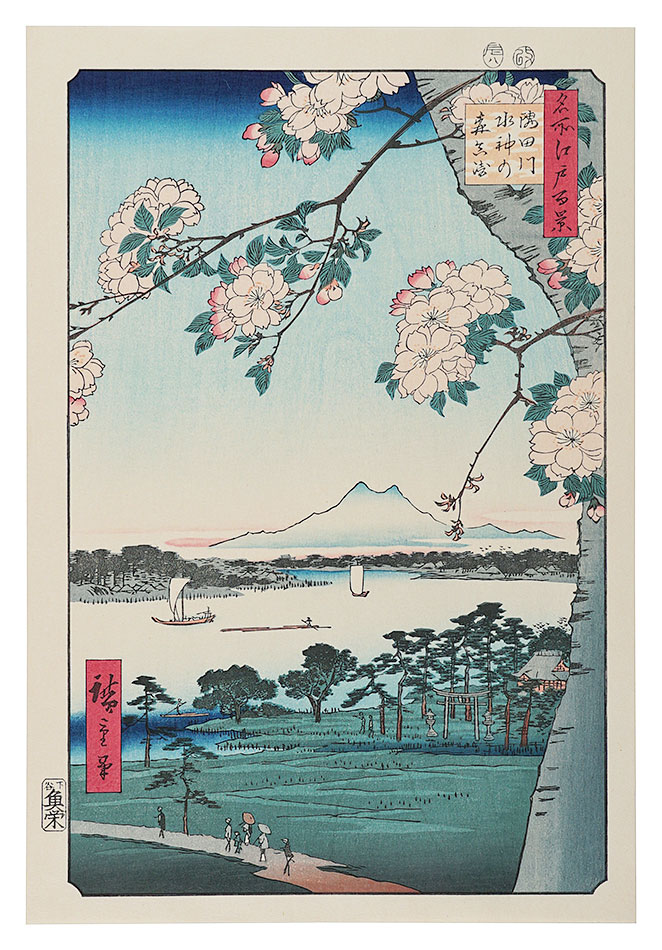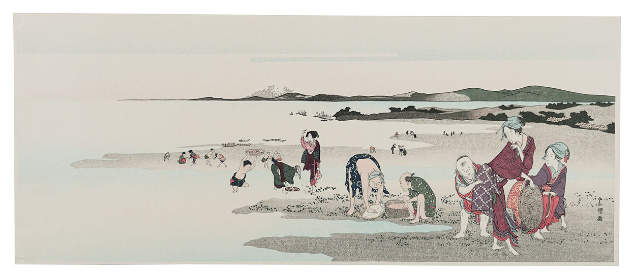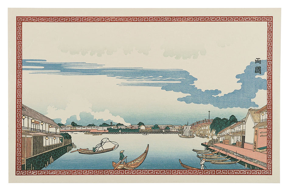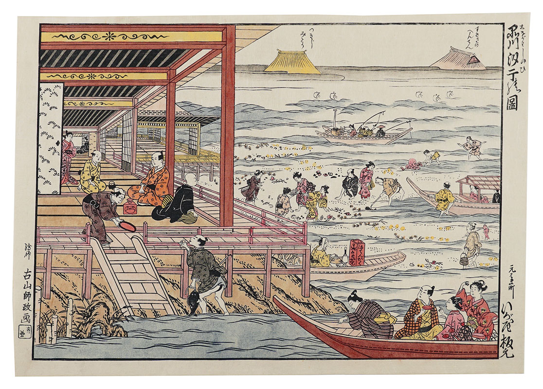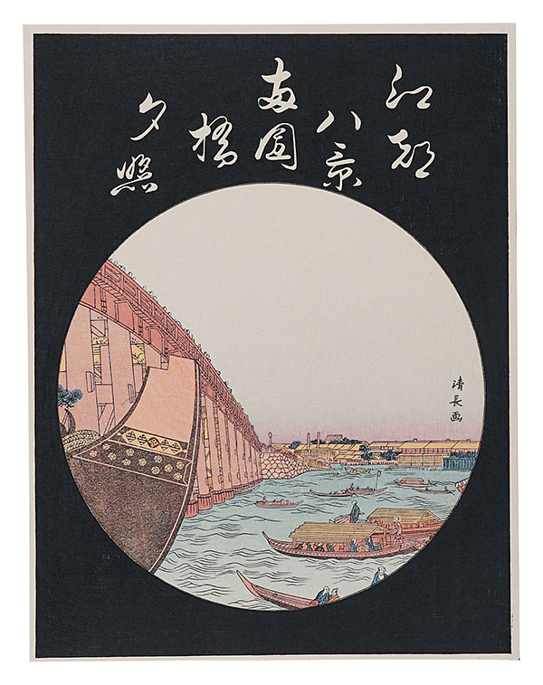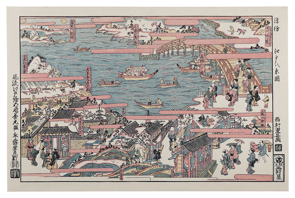 清倍:定家の道行(極少点シミ)/師政:品川汐干の図/沖信:寿の字江戸名所/政信:新吉原大門口仲之町浮絵根元/清倍二代:志だの小太郎/重長:浮絵江戸八景図/春信:風流江戸八景 両国橋夕照/春重:楼上椽端美人(マージン極少点シミ)/豊春:浮絵 洛陽四条河原夕涼図/春章:きさらぎ はつ午 梅見/清長:江戸八景 両国橋夕照/歌麿:雪の曳舟 -「銀世界」より-/北斎:たかばしのふじ/北斎:新板浮絵 王子稲荷飛鳥山之図/北斎:琉球八景 筍崖夕照/北斎:汐干狩(貼付箇所少シワ)/北寿:東都日本橋風景/北渓:江の島/辰斎:両国(極少点シミ)/五岳:大阪天保山夕立の景/豊広:江戸八景 佃島帰帆(貼付箇所極少シワ)/豊国二代:名勝八景 大山夜雨(マージン極少シミ)/国貞:霧中ノ山水/国芳:東都名所 新吉原(マージン極少シミ)/国虎:羅得島湊紅毛船入津之図/国長:阿蘭陀浮絵亜細亜洲巴必鸞城/英泉:月夜山水/広重:木曽海道六拾九次之内 大井/広重:六十余州名所図会 美作山伏谷(マージン少シミ)/広重:名所江戸百景 隅田川水神の森 眞崎/広重:豆相箱根山中湖水之図/広重二代:隅田川八景 橋場暮雪/清親:東京新大橋雨中図/清親:浅草田甫太郎稲荷
