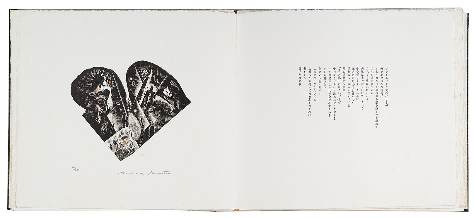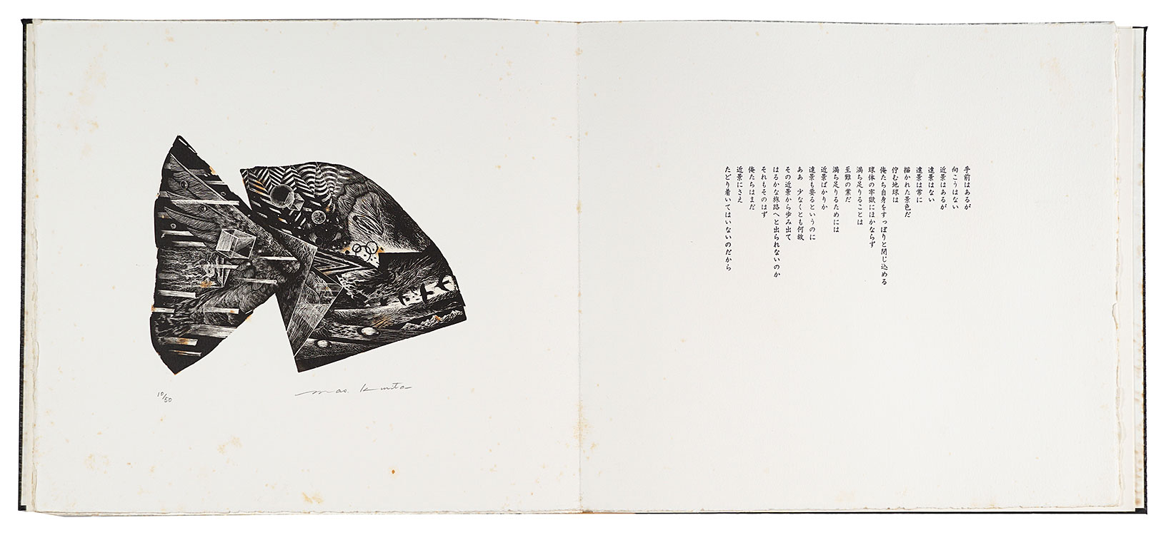 詩:松本信洋 木口木版4図(番号・サイン) 限50 シミ ハードカバー ビニールカバー(汚レ、切レ有) 二重箱(少汚レ、外箱傷ミ有) 三木蘭宛の挨拶状(少汚レ、欠ケ有) 25.8×29.4cm