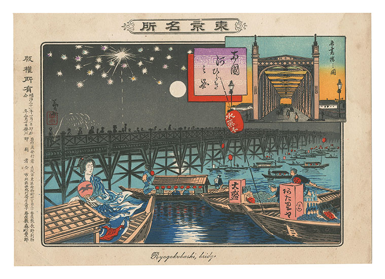 Toshimoto “Famous Places in Tokyo / The River Opening at Ryogoku and Azuma Bridge” | Yamada Shoten | Tokyo, Japan