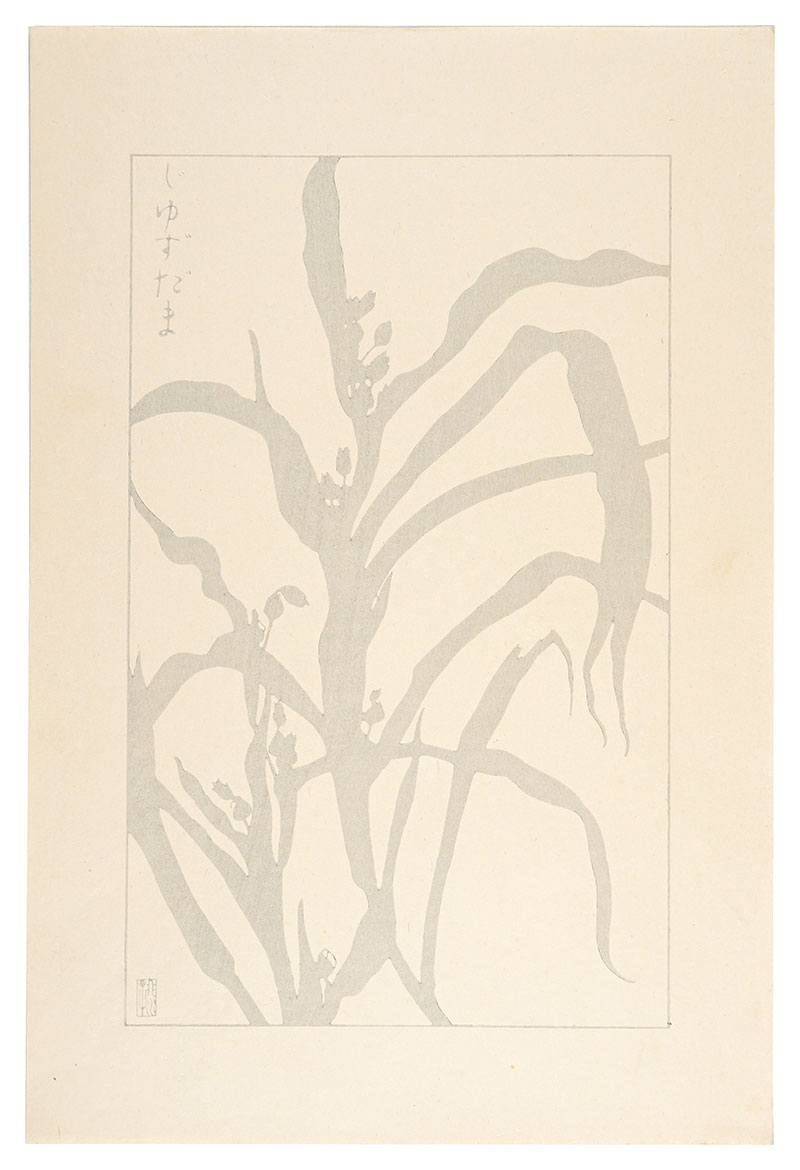 「非水百花譜」には初版と再版が存在する。震災によって版木が消失したため、非水の手元にあった原画を元に新たに版木を彫りおこして制作、春陽堂刊。摺は田口喜久松。作品裏に「非水百花譜著者検章」が貼られている。初版と再版では紙やインクなど質感が多少の変化が見られ、モチーフも5点が異なる。本作は再版の為、「鼠色一色の木版摺の投影写生図」と「該当植物の写真図版付きの詳細な解説」のそれぞれが独立して3枚で1セットとなっている。