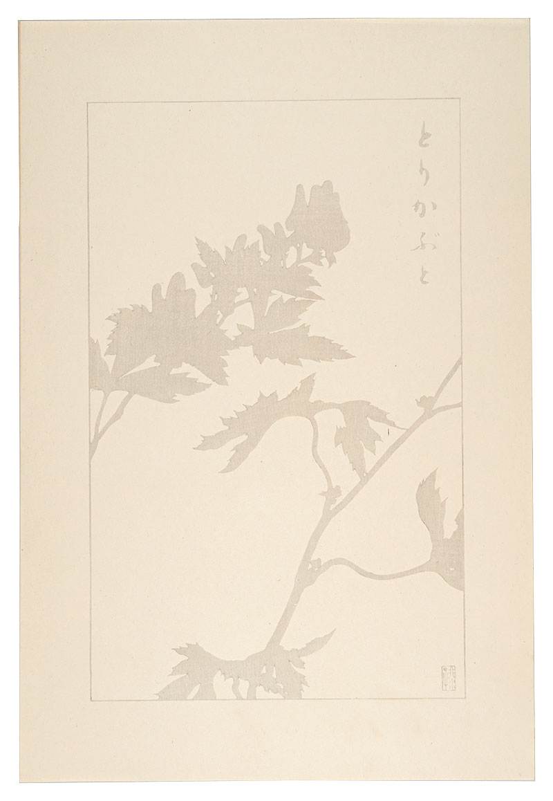 「非水百花譜」には初版と再版が存在する。震災によって版木が消失したため、非水の手元にあった原画を元に新たに版木を彫りおこして制作、春陽堂刊。摺は田口喜久松。作品裏に「非水百花譜著者検章」が貼られている。初版と再版では紙やインクなど質感が多少の変化が見られ、モチーフも5点が異なる。本作は再版の為、「鼠色一色の木版摺の投影写生図」と「該当植物の写真図版付きの詳細な解説」のそれぞれが独立して3枚で1セットとなっている。