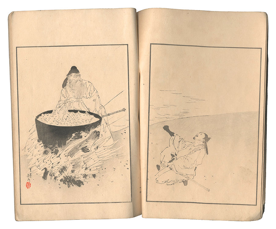 松本楓湖「神武天皇八十梟師を撃つ図」/渡辺省亭「武内兄弟湯を探る図」/三島蕉窓「弘計王舞を為す図」/永峰秀湖「形名の妻虜を却く図」/高橋松亭「役小角呪術を善くする図」/大塚蒼湖「清麿豊永に逢ふ図」/村岡桜塘「平将門を誅す図」