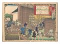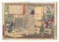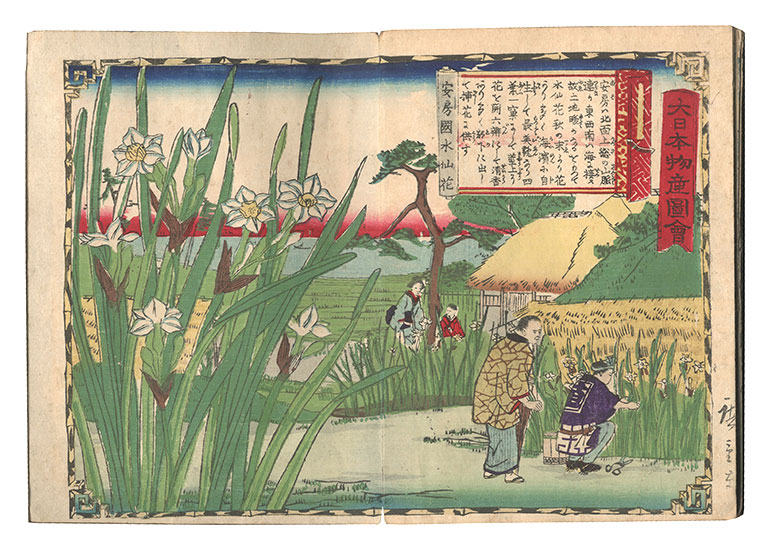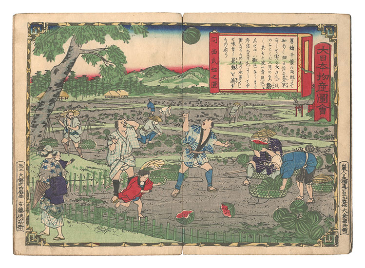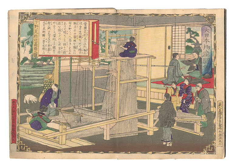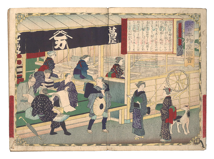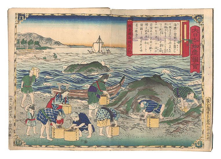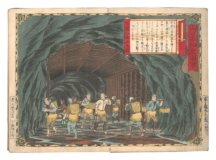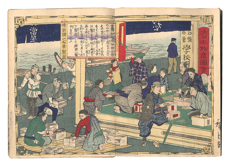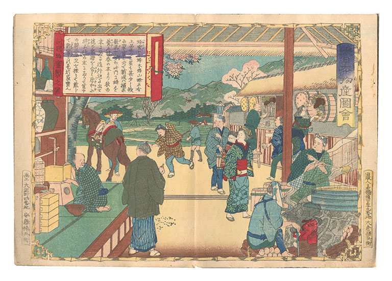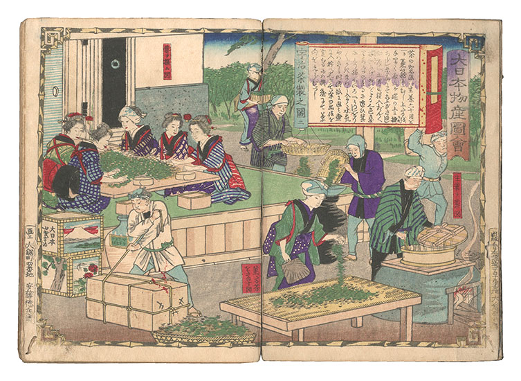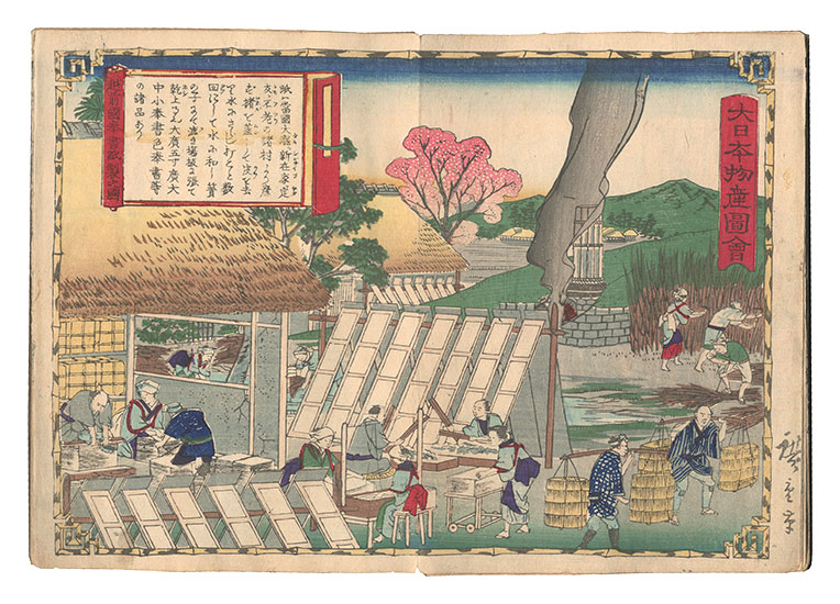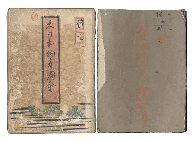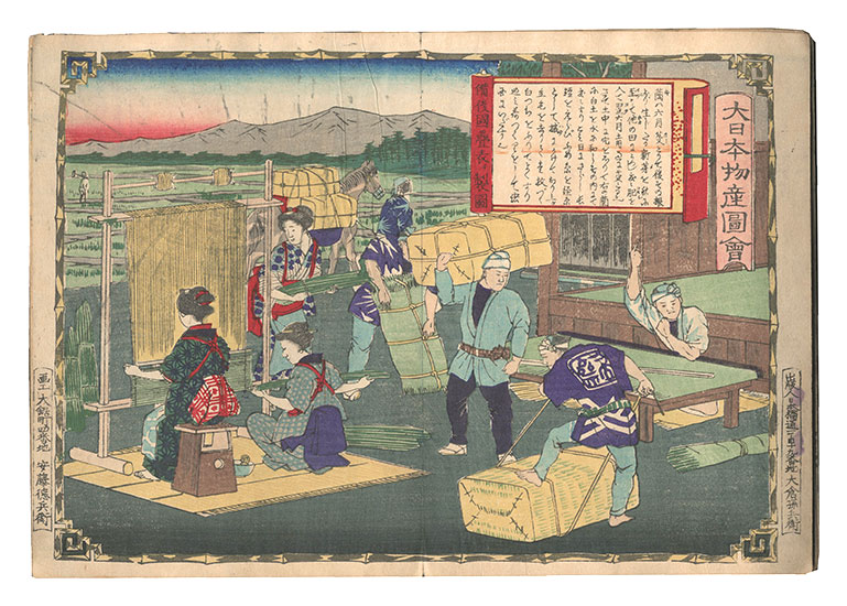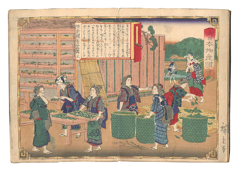 山城国宇治茶摘図 一/宇治茶製之図 二(中折レ部分真っ二つの切レ補修)/河内木綿織機之図/河内国 木綿ヲ摘採ル図/大和国葛ノ根ヲ掘図/大和国葛之粉製図/同国石炭山之国/伊豆国椿の油を取図/同炭焼場之図/東京錦絵製造之図/武蔵国浅草海苔製図/下総国醤油製造之図(中折レ部分大きく切レ有)/同西瓜畑之図/美濃国石灰山之図/美濃石灰焼之図/信濃国氷中八ツ目鰻採ノ図/信州蕎麦切製造之図/若狭国鰈を取図(中折レ部分真っ二つの切レ補修)/同蒸鰈製造之図/丹波国燧石切出之図(蔵印有)/日州緑磐製之図/備前岡山石筆製図/駿河国竹細工製ノ図/安芸国厳島楊枝ヲ鬻図/同国漆取之図/陸前国ノ養蚕図 五/備前国白魚漁之図/飛州猪捕之図/佐渡金掘之図/同国五色砂ニテ盆石飾/備後国畳表ヲ製図/三河国名倉砥切出ノ図/同国サンマ網之図/磐城国養蚕之図 四/越前国海膽取之図/同国蜂蜜製之図/下野足利辺高機之図/同広島牡蠣畜養之図/日向国樟脳製之図/駿河半紙漉場ノ図/磐城国野馬捕之図/同国松島景並埋木細工之図/越前国奉書紙製之図/下野国養蚕図 三(中折レ部分大きく切レ有)/志摩国荒布刈之図/飛騨国養蚕之図 二/佐渡国金山之図/備後国藺を植ル図/安房国水仙花