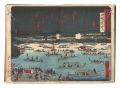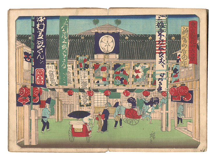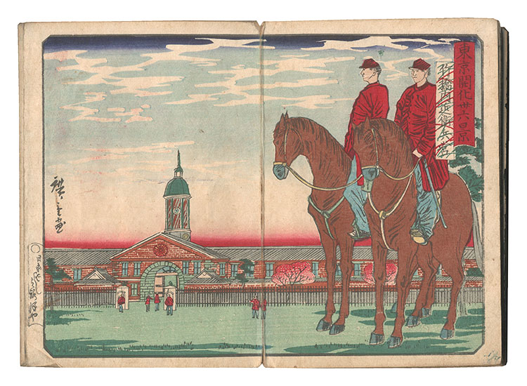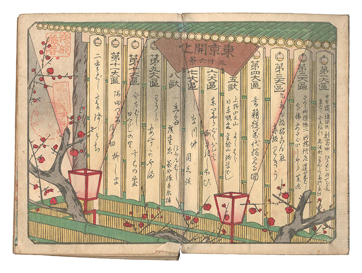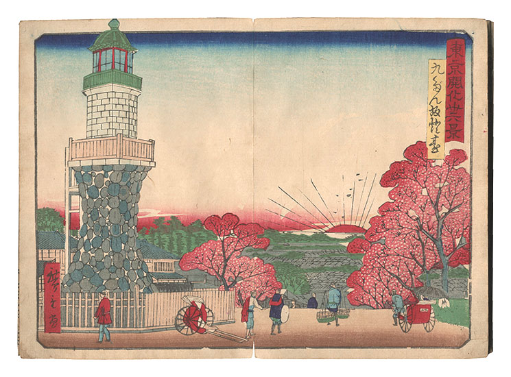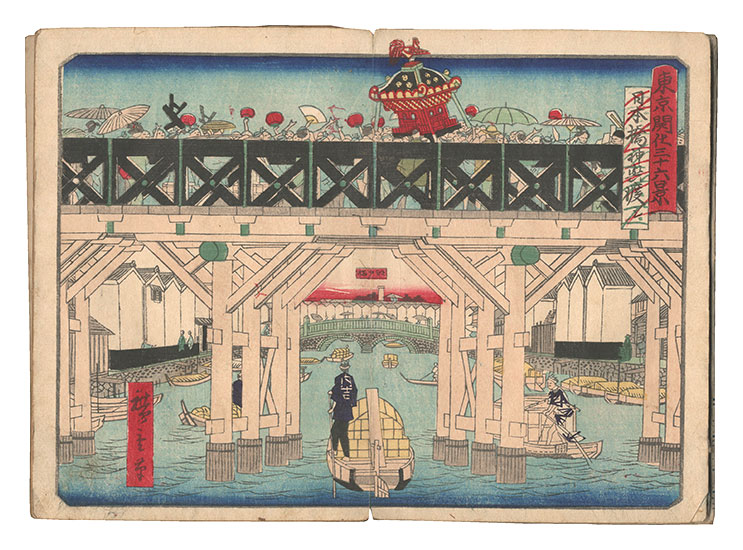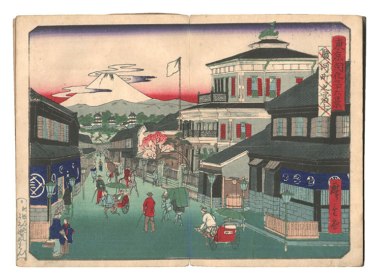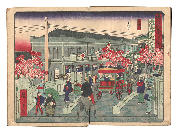 日本橋神輿渡シ/京ばしヨリ銀座の図/駿河町之富士/海運橋国立銀行/新富町守田座/尾張町島田店掛り/江戸橋駅逓寮図(波打ち有)/蠣殻丁商行会社/かきがら町水天宮(中折レ部分大きく切レ有)/外桜田練兵場ノ図/八ツ山下鉄道之夜景/新ばし鉄道館/芝あたこ山の雪/しん橋より蓬莱舎/芝増上寺内円山ノ景/九だん坂灯台/赤坂離宮紀ノ国坂/駿河台ヨリ目鏡橋図/東叡山清水堂/上野東照宮之図/新吉原仲之町花盛/浅草寺ノ雪景/浅草橋ヨリ柳橋ノ景/両国之大花火/洲崎のしほ干/品川沖/目黒不動の瀧/王子海扇の二楼/飛鳥山かわらけなけ(波打ち有)/真乳山の夕雨(波打ち有)/日くらしすはの台(少シワ有)/隅田堤満花之図/堀きり花菖蒲(少シワ有)/柳島妙見の図(少シワ有)/皇城二重橋ノ景/竹橋内近衛兵営