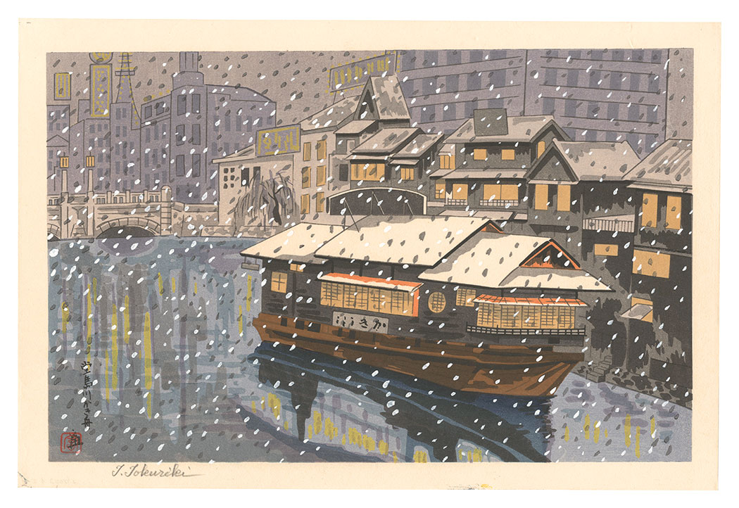 Tokuriki Tomikichiro “Restaurant Boat Serving Oysters at the Dojima River” | Yamada Shoten | Tokyo, Japan