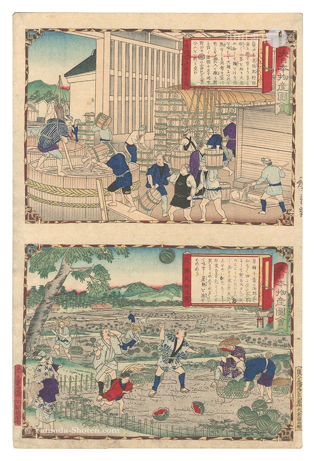 Hiroshige III “Famous Products of Japan / Shimosa Province: Soy Sauce Brewery; Watermelon Field” | Yamada Shoten | Tokyo, Japan