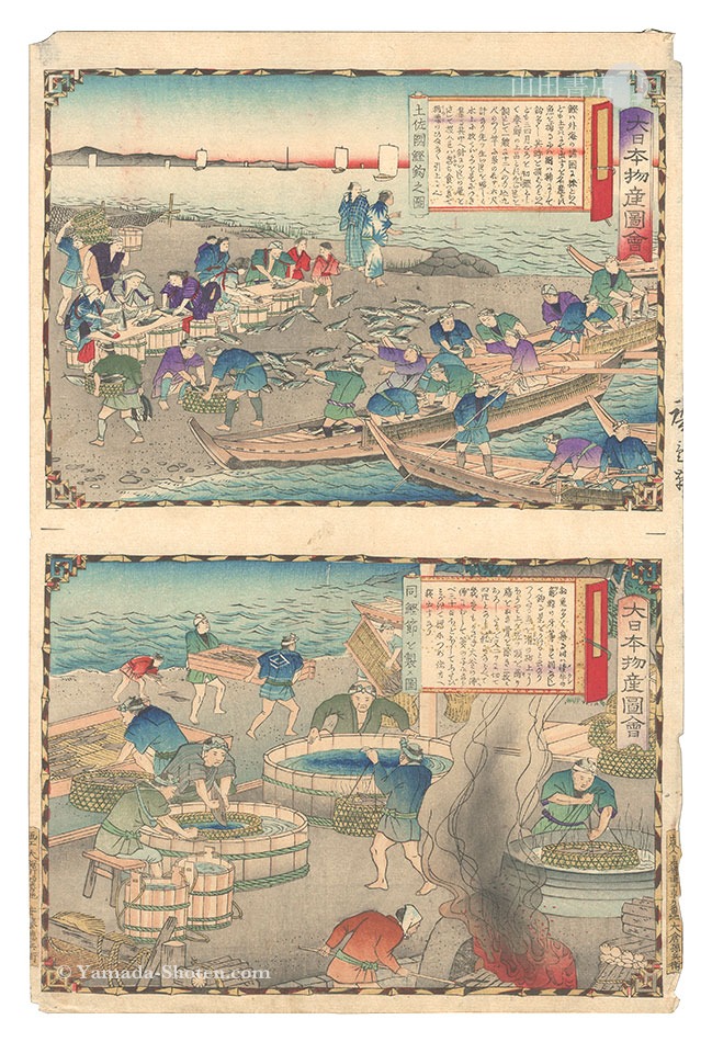 Hiroshige III “Famous Products of Japan / Tosa Province: Bonito Fishing; Making Dried Bonito” | Yamada Shoten | Tokyo, Japan