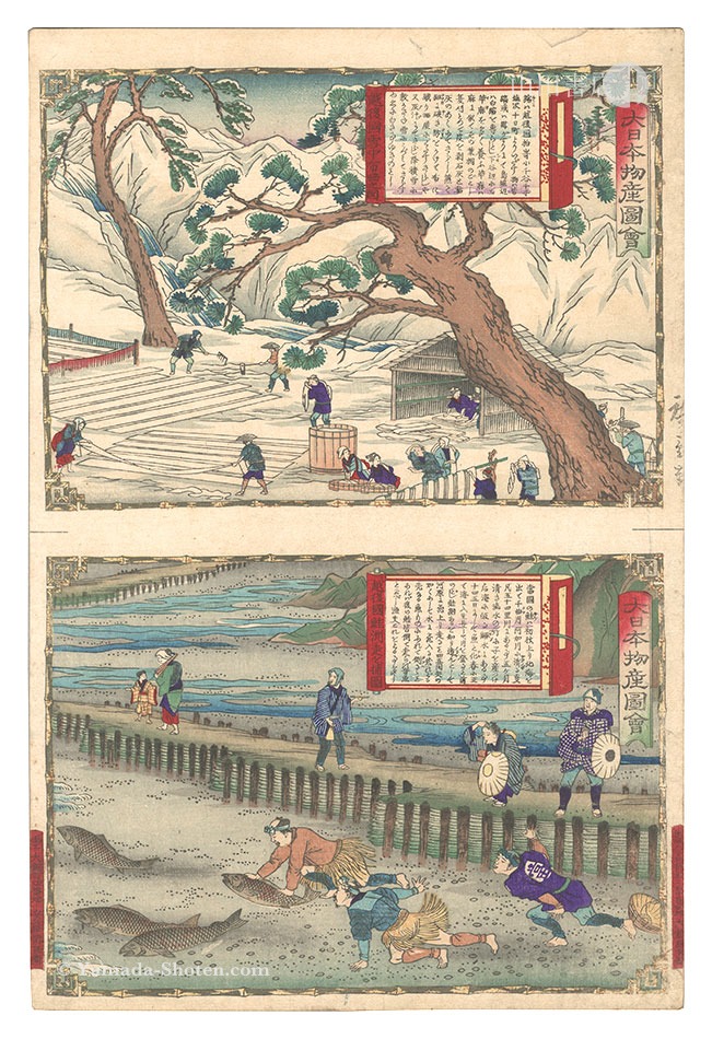 Famous Products of Japan / Echigo Province: Bleaching Cloth in Snow; Catching Salmon
