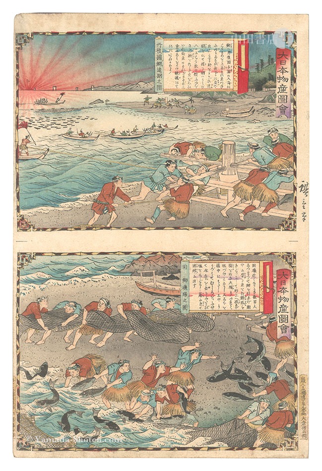 Hiroshige III “Famous Products of Japan / Tango Province: Yellowtail Oiami Fishing; Yellowtail Fishing Shore” | Yamada Shoten | Tokyo, Japan