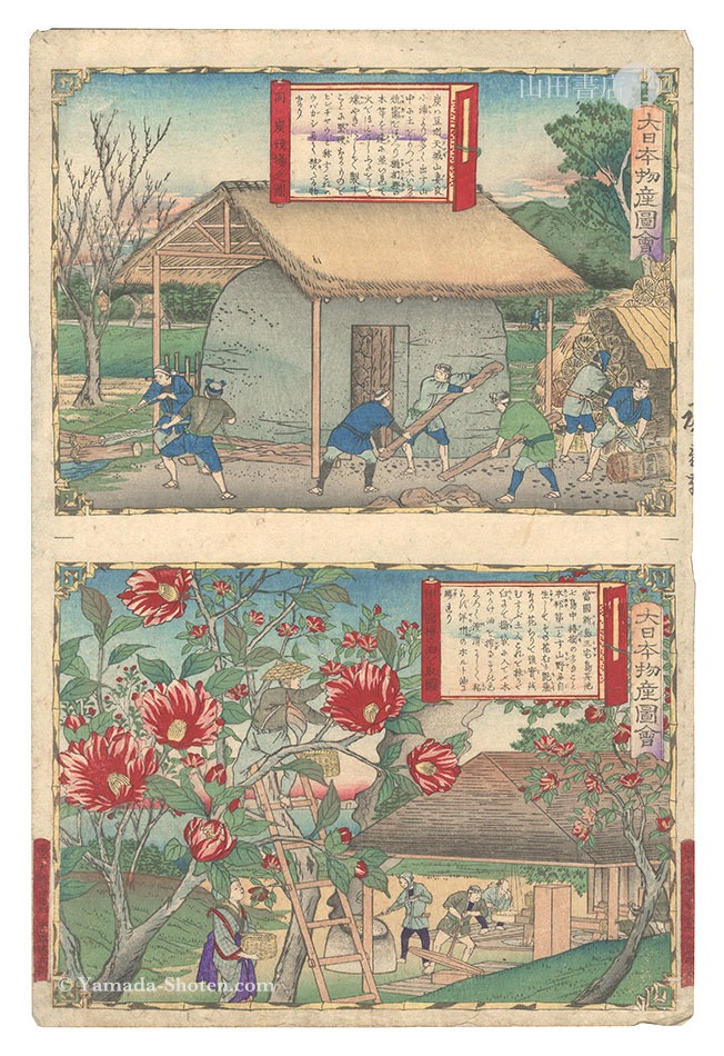 Hiroshige III “Famous Products of Japan / Izu Province: Making Camellia Oil; Making Charcoal” | Yamada Shoten | Tokyo, Japan