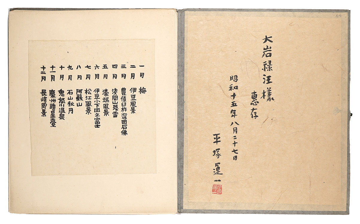 1月:梅/2月:伊豆風景/3月:豊後臼杵深田石仏/4月:浅間山残雪/5月:濠端風景/6月:伊豆小下田之富士/7月:松江風景/8月:阿蘇山/9月:石山秋月/10月:鬼怒川温泉/11月:慶州瞻星臺/12月:長崎風景