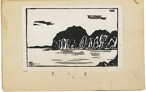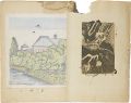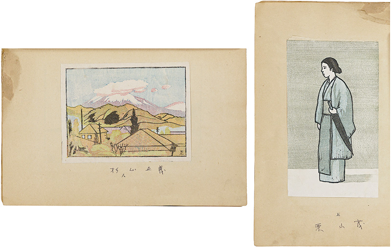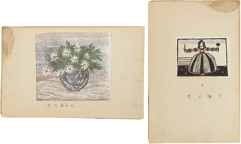 木版10枚の内2枚欠 中村岳:風景/小川龍彦:少年写生/小坂義龍:だりや(欠)/杉山正義:風景/内田達次:ゆり(欠)/外川春子:花/栗山彌生:人形/杉山正義:風景/小川龍彦:狂女/栗山茂:大崩風景 中村岳:扉絵(左上角折レ・右上角破レ 木版装(中村岳) 山田繁旧蔵裏表紙に記名・中少書込 表紙・頁の一部大きく欠損・傷ミ 山田繁の年賀状(木版)貼付有 29.5×21.5cm