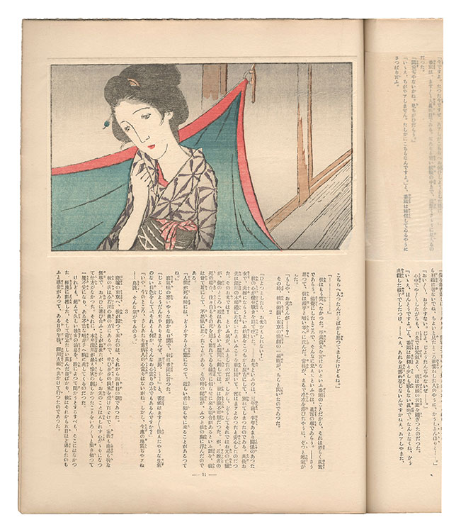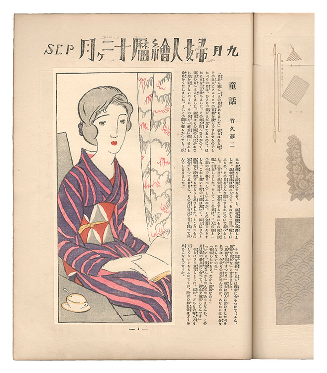 木版表紙:竹久夢二「秋」(シミ、少ヤケ、シワ) 婦人絵暦「童話」 「お光の亡霊」 他木版挿絵・カット3枚(1枚折レ有) 少ヤケ 少汚レ 綴ジ穴 表紙・背切レ 背表紙に番号押印 32.6×24.5cm