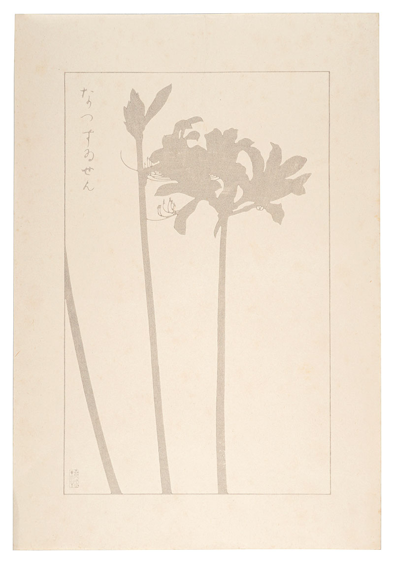 「非水百花譜」には初版と再版が存在する。震災によって版木が消失したため、非水の手元にあった原画を元に新たに版木を彫りおこして制作、春陽堂刊。摺は田口喜久松。作品裏に「非水百花譜著者検章」が貼られている。初版と再版では紙やインクなど質感が多少の変化が見られ、モチーフも5点が異なる。本作は再版の為、「鼠色一色の木版摺の投影写生図」と「該当植物の写真図版付きの詳細な解説」のそれぞれが独立して3枚で1セットとなっている。