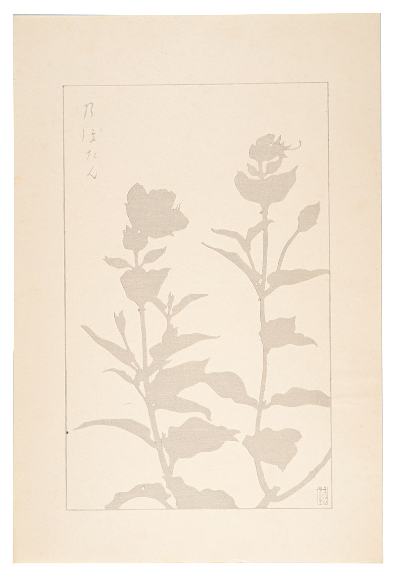 「非水百花譜」には初版と再版が存在する。震災によって版木が消失したため、非水の手元にあった原画を元に新たに版木を彫りおこして制作、春陽堂刊。摺は田口喜久松。作品裏に「非水百花譜著者検章」が貼られている。初版と再版では紙やインクなど質感が多少の変化が見られ、モチーフも5点が異なる。本作は再版の為、「鼠色一色の木版摺の投影写生図」と「該当植物の写真図版付きの詳細な解説」のそれぞれが独立して3枚で1セットとなっている。