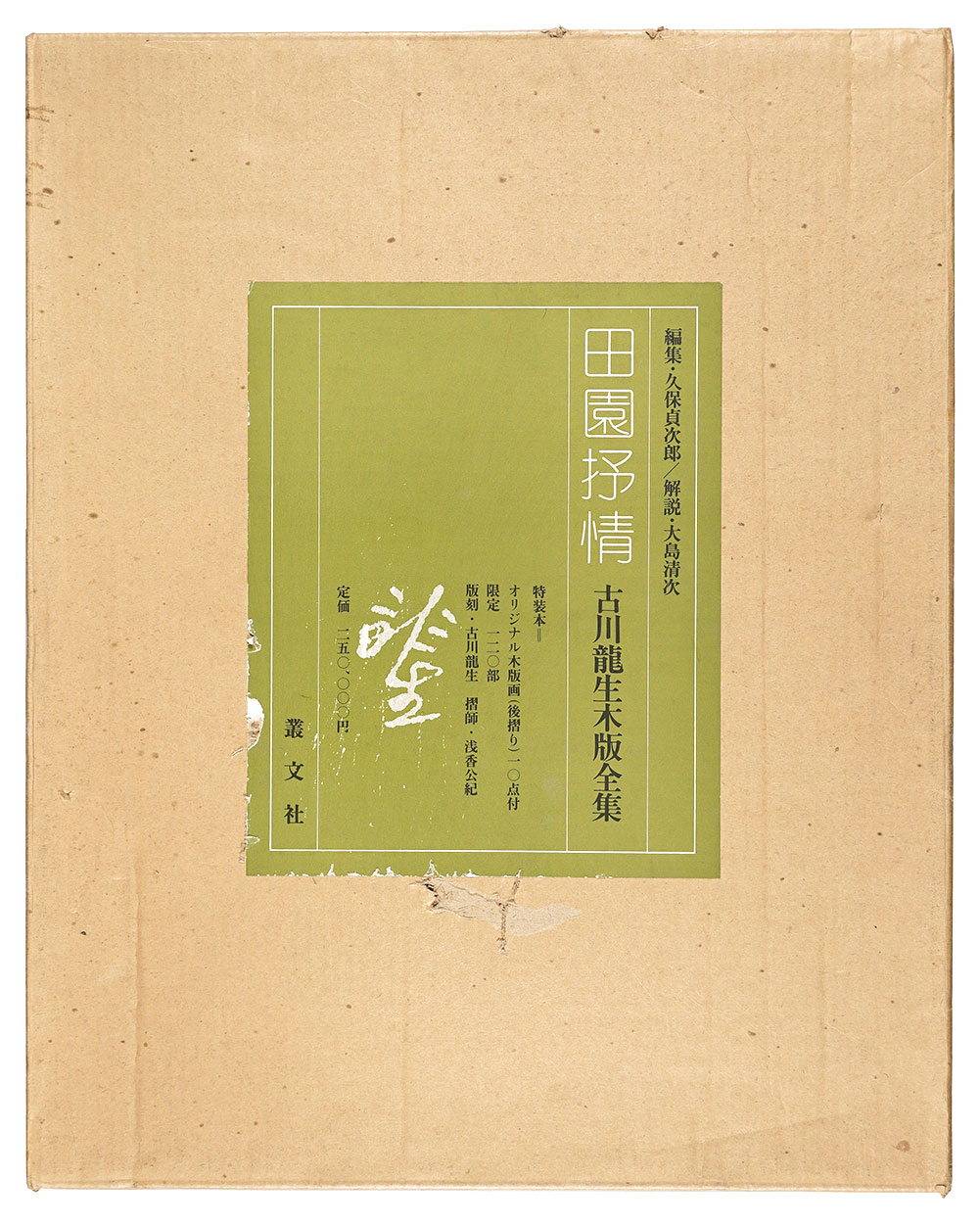 特装本 限120 図版415点(作品名/制昨年/展覧会他) 関野凖一郎:田園抒情詩の古川龍生/北岡文雄:古川さんの版画とその変遷他 オリジナル木版10枚(シミ有):版刻(古川龍生)・後摺(浅香公紀摺) 少シミ 表紙汚レ ハードカバー 布装 カバー 箱(汚レ、少切レ、外箱傷ミ有 48.8×39cm) 30×22.5cm