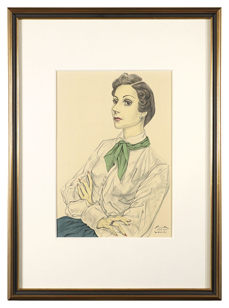 スペインの演劇・映画史上有名な女優、コンチータ・モンテス夫人を描いた版画作品。ピカソ、ダリ等とも親交があり、現代美術のビッグコレクターとしても知られていた彼女を讃えるため、1951年のクリスマスに藤田が制作した。