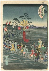 文久3年(1863)、江戸幕府第十四代将軍徳川家茂は孝明天皇に開国を言上するため、三代将軍家光以来229年ぶりとなる上洛を行いました。3000人余の武装行列を従えた様子は幕末の世に衝撃を与え、当時出版された東海道絵にもその様子が描かれており、それらは”御上洛東海道”と呼ばれています。今作もその一つで、月岡芳年、落合芳幾、歌川貞秀、二代歌川広重、豊原国周らが分担して描き、慶応元年(1865年)に出版されました。